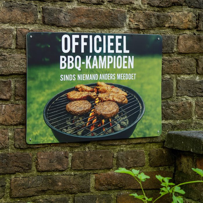 Officieel BBQ Kampioen metalen bord met een formaat van 20 x 30 cm