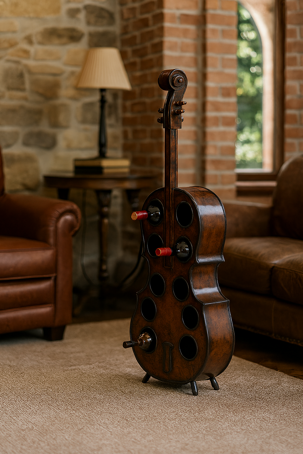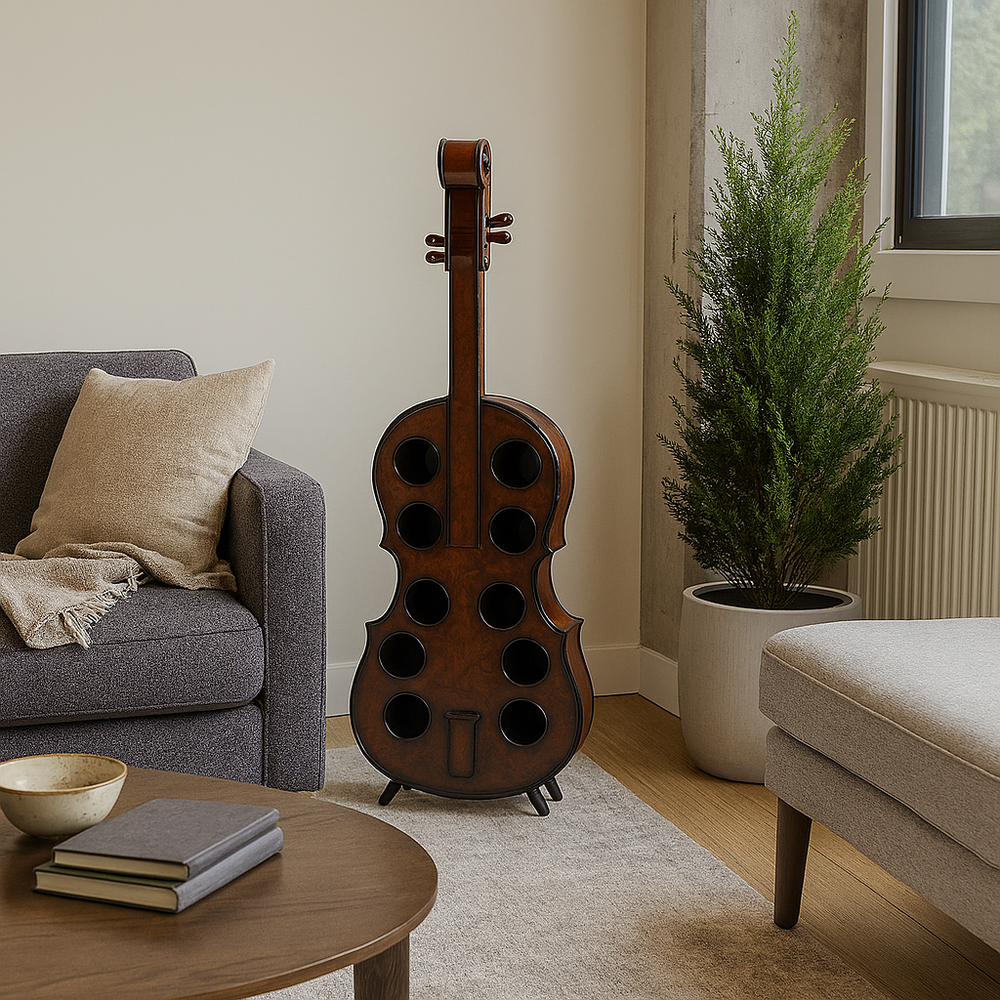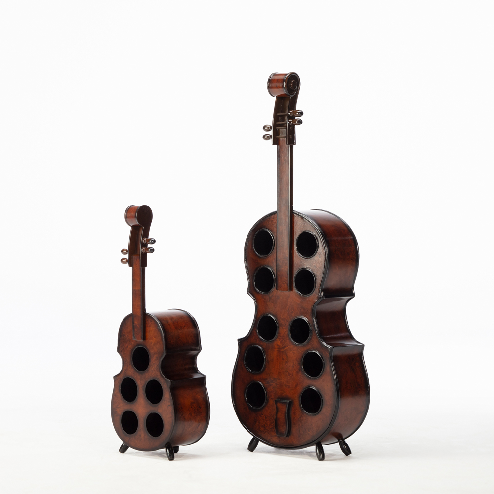 Decoratieve flessenhouder in cello vorm, gemaakt van hout.