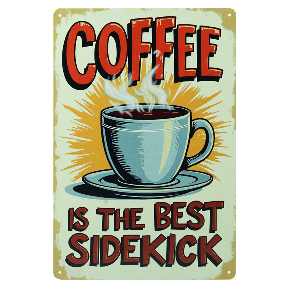 Het coffee is the best sidekick metalen bord is een herkenbare en leuke toevoeging voor iedereen die de dag niet kan beginnen zonder koffie. De tekst “Coffee Is The Best Sidekick” in combinatie met de illustratie van een dampende koffiekop zorgt voor een warme en uitnodigende uitstraling.