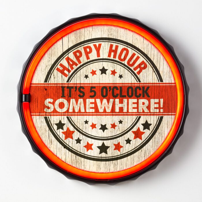 Mancave neon verlichting. Dit happy hour neon bord heeft de vorm van een bierdop en is 30 cm groot