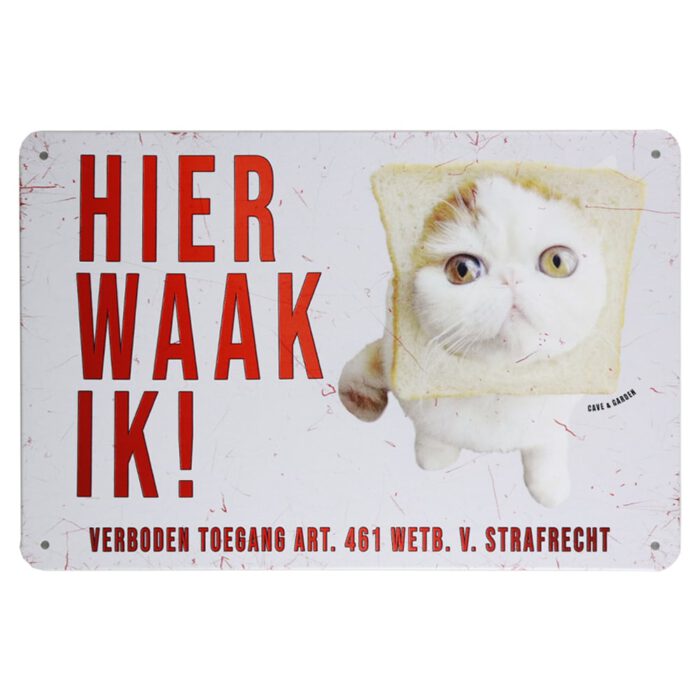 Super grappig metalen bordje van een kat met een boterham op zijn gezicht.