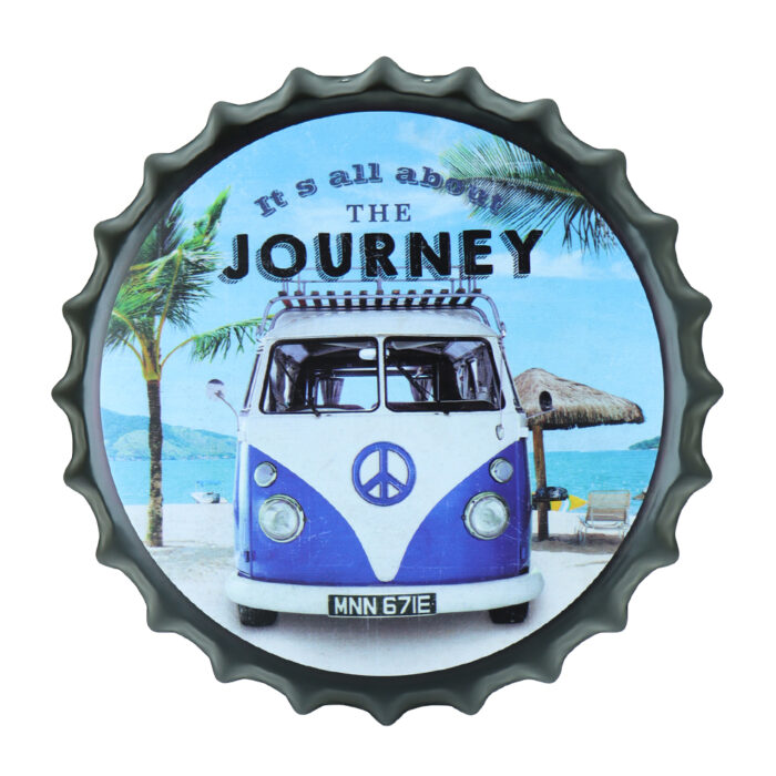 Het opvallende ontwerp toont een iconische Volkswagen camper met de inspirerende tekst It’s All About the Journey.