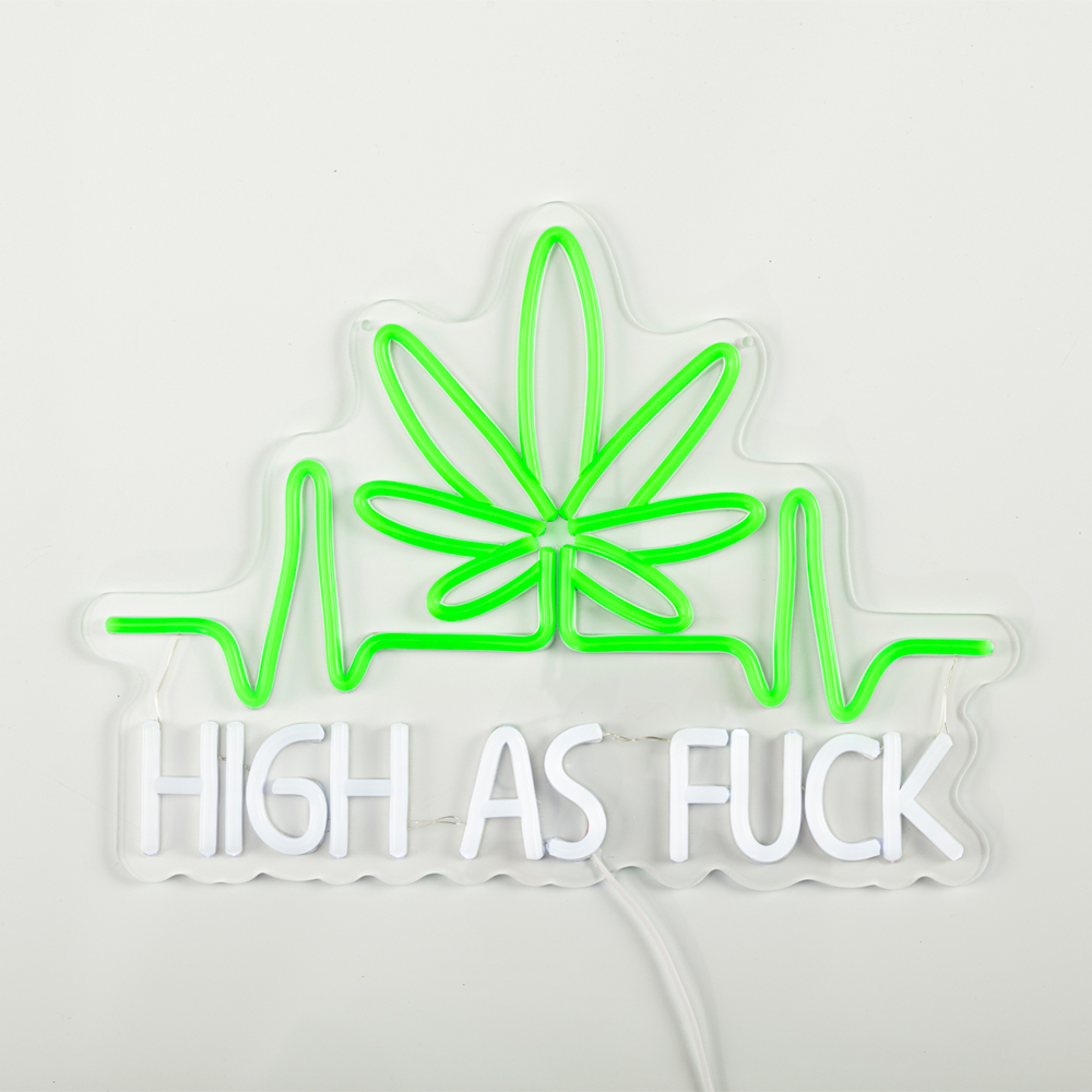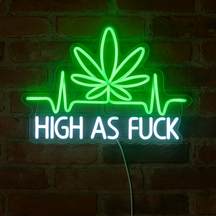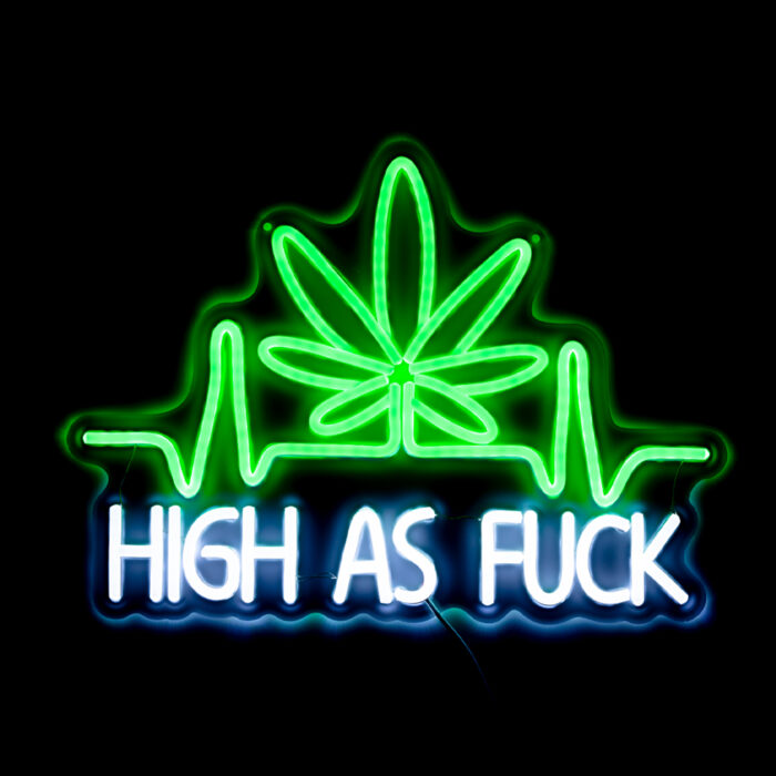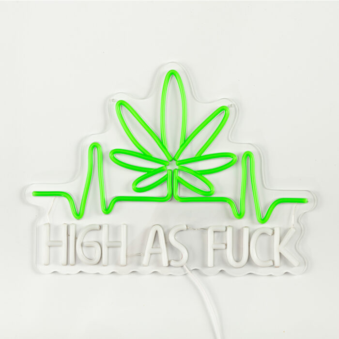 Dit neon bord wiet met de tekst ‘High As Fuck’ is perfect voor jouw mancave of feestplek.