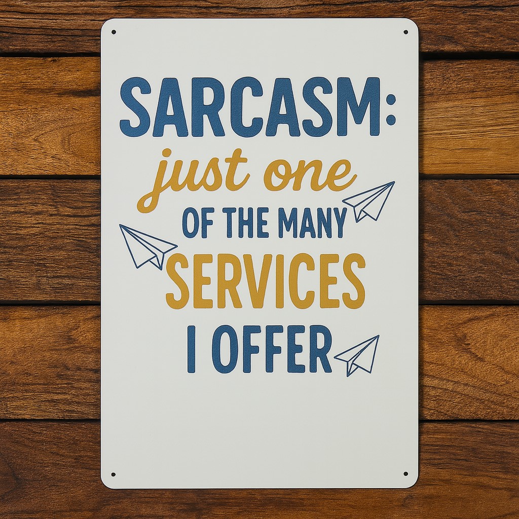 Metalen wandbord met sarcastische tekst: “ Sarcasm: just one of the many services I offer”. Het bord is 20 x 30 cm groot, UV-bestendig en bedrukt met eco-vriendelijke inkt. Perfect voor thuis, op kantoor of als cadeau voor sarcastische vrienden.