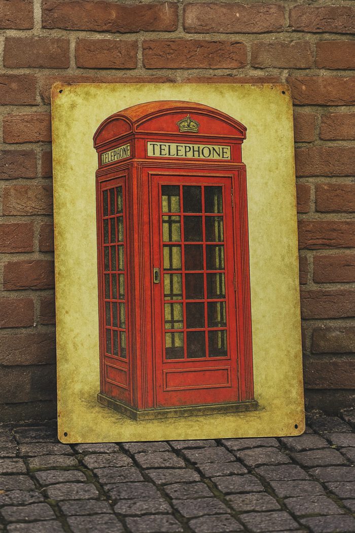 Metalen wandbord met klassieke rode Engelse telefooncel. 20 x 30 cm, UV-bestendig en bedrukt met eco-vriendelijke inkt. Perfect voor liefhebbers van vintage, Engeland of retro muurdecoratie.