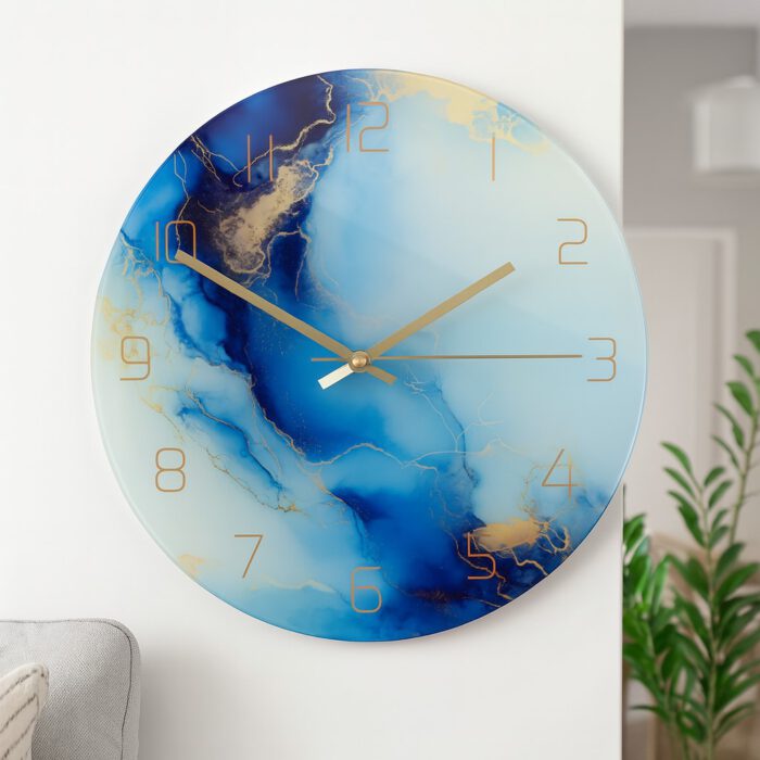 Wandklok blauw goud met luxe marmerlook en gouden wijzers.