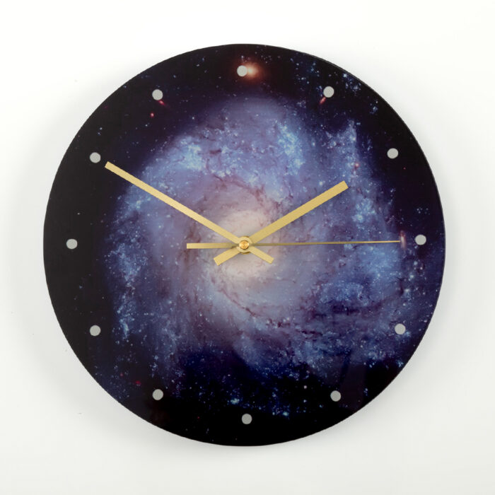 Wandklok sterrenstelsel met galaxy design en gouden wijzers.
