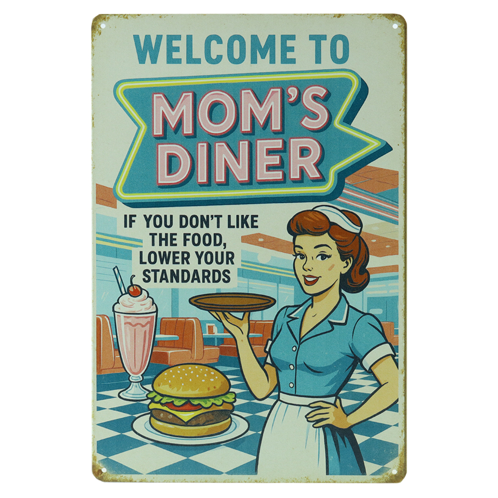 Het Welcome To Moms Diner metalen bord brengt een herkenbare en gezellige sfeer in elke ruimte. De tekst “Welcome To Moms Diner – If you don’t like the food, lower your standards” zorgt voor een knipoog en maakt het bord leuk voor iedereen die houdt van humor en retro decoratie.